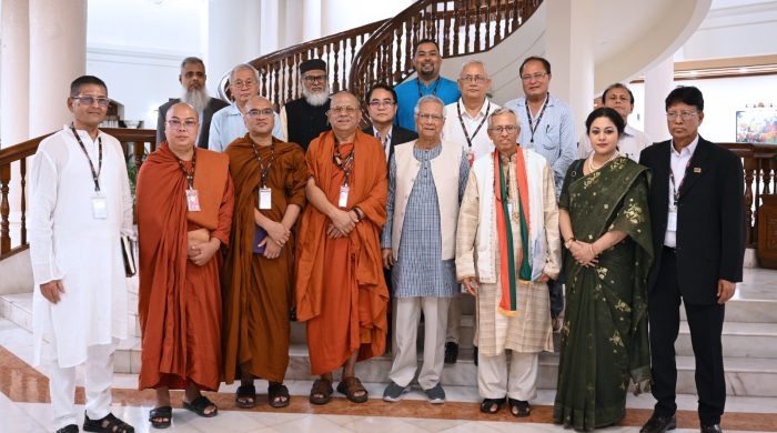 প্রবারণা পূর্ণিমা উপলক্ষে প্রধান উপদেষ্টা প্রফেসর মুহাম্মদ ইউনূসের সঙ্গে শুভেচ্ছা বিনিময় করেছেন বৌদ্ধ ধর্মীয় নেতৃবৃন্দের প্রতিনিধিদল।